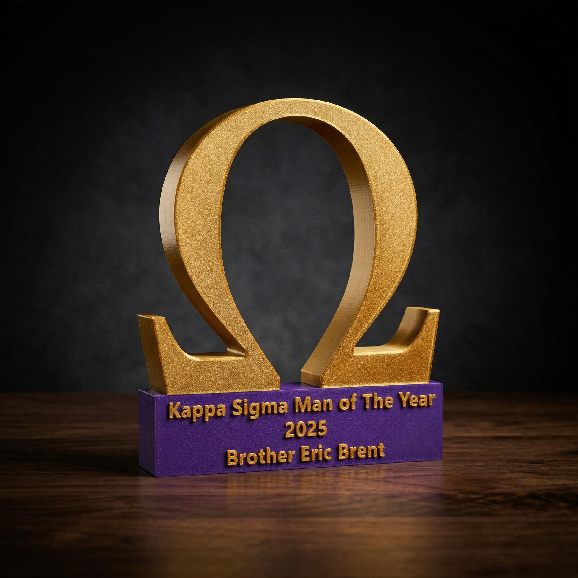 Make a lasting statement with old gold Omega. This trophy can be customized with your choice of text on its purple base, as shown here in our example 'Man of the Year 2025' for Brother Eric Brent. It's the ultimate centerpiece for a trophy case or desk.